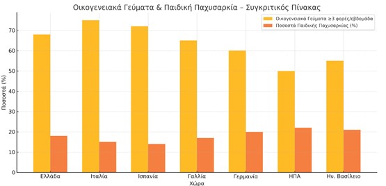 - Η Ελλάδα, με σχετικά υψηλή συχνότητα κοινών γευμάτων, διατηρεί ακόμα συγκριτικά μέτρια ποσοστά παιδικής παχυσαρκίας – όμως παρατηρείται τάση επιδείνωσης τα τελευταία χρόνια (βάσει στοιχείων του ΕΥΖΗΝ και του ΕΔΠΕ)